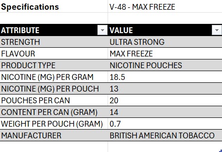 Push your limits with V-48 Max Freeze, our ultra strong option featuring 17.0mg of nicotine per pouch. An intense arctic blast delivers maximum cooling power and uncompromising strength for the most demanding users.